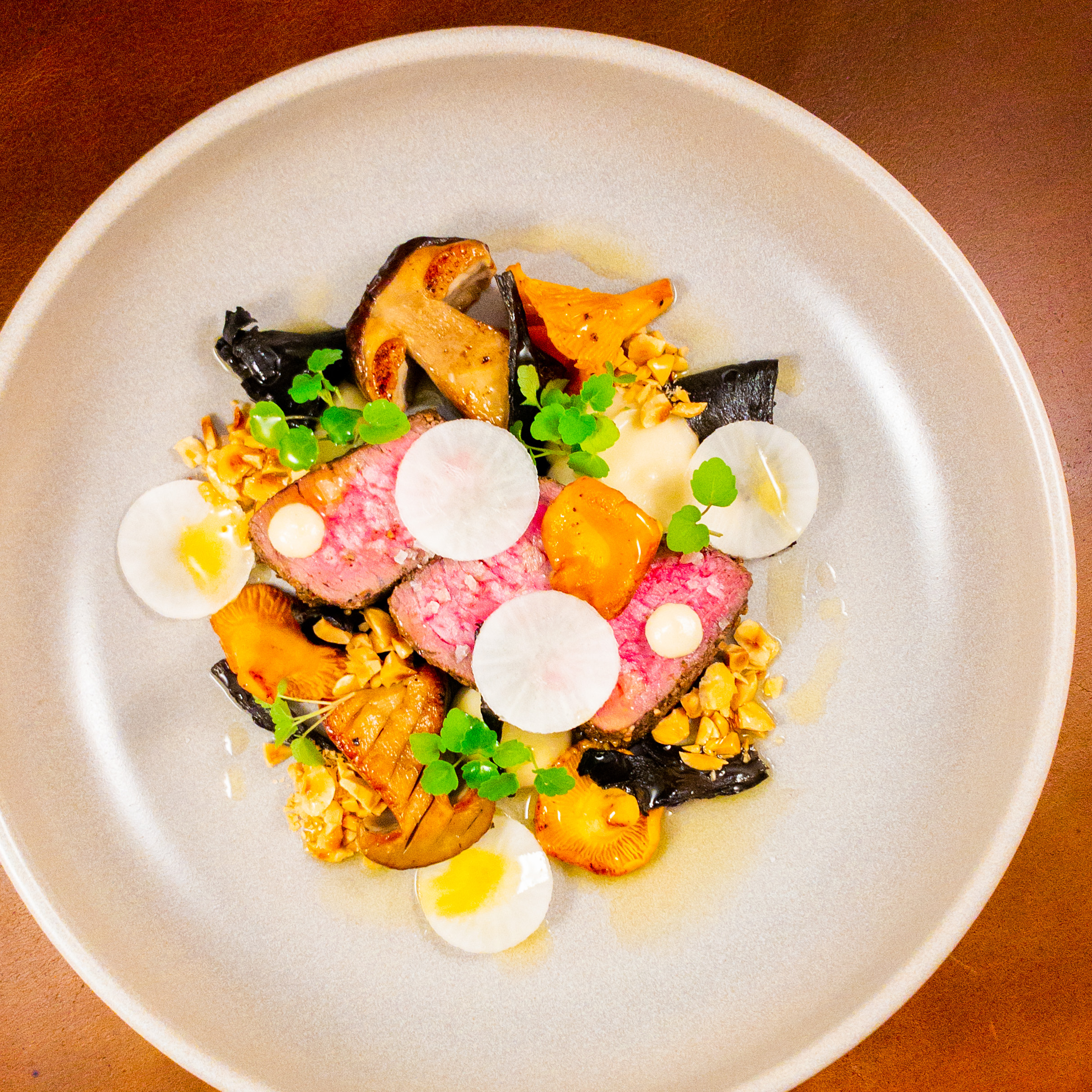Because this combination of flavors is so cool. A steak is of course always tasty and that also applies to mushrooms as far as I'm concerned. The addition of Jerusalem artichoke and hazelnuts makes this dish. Secretly I'm especially proud of the Jerusalem artichoke cream, that taste… I'll tell you the secret, the rest is of course in the recipe. Instead of normal butter I added beurre noisette, infused with tarragon.