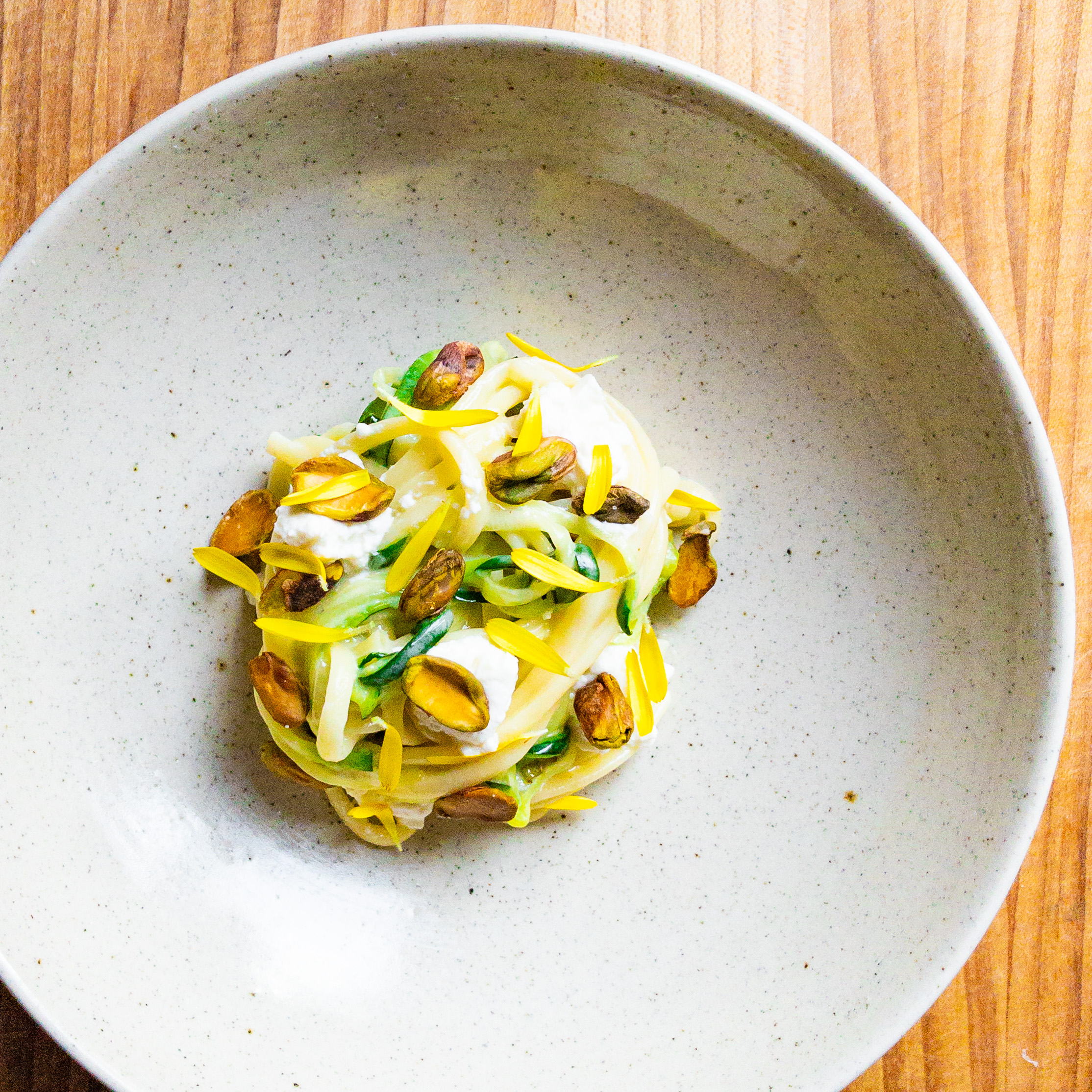 - Verhit een scheutje olijfolie in de grote koekenpan die je ook voor de pistachenoten hebt gebruikt en bak hierin de courgetti tot hij beetgaar is, zo’n 5 minuten.