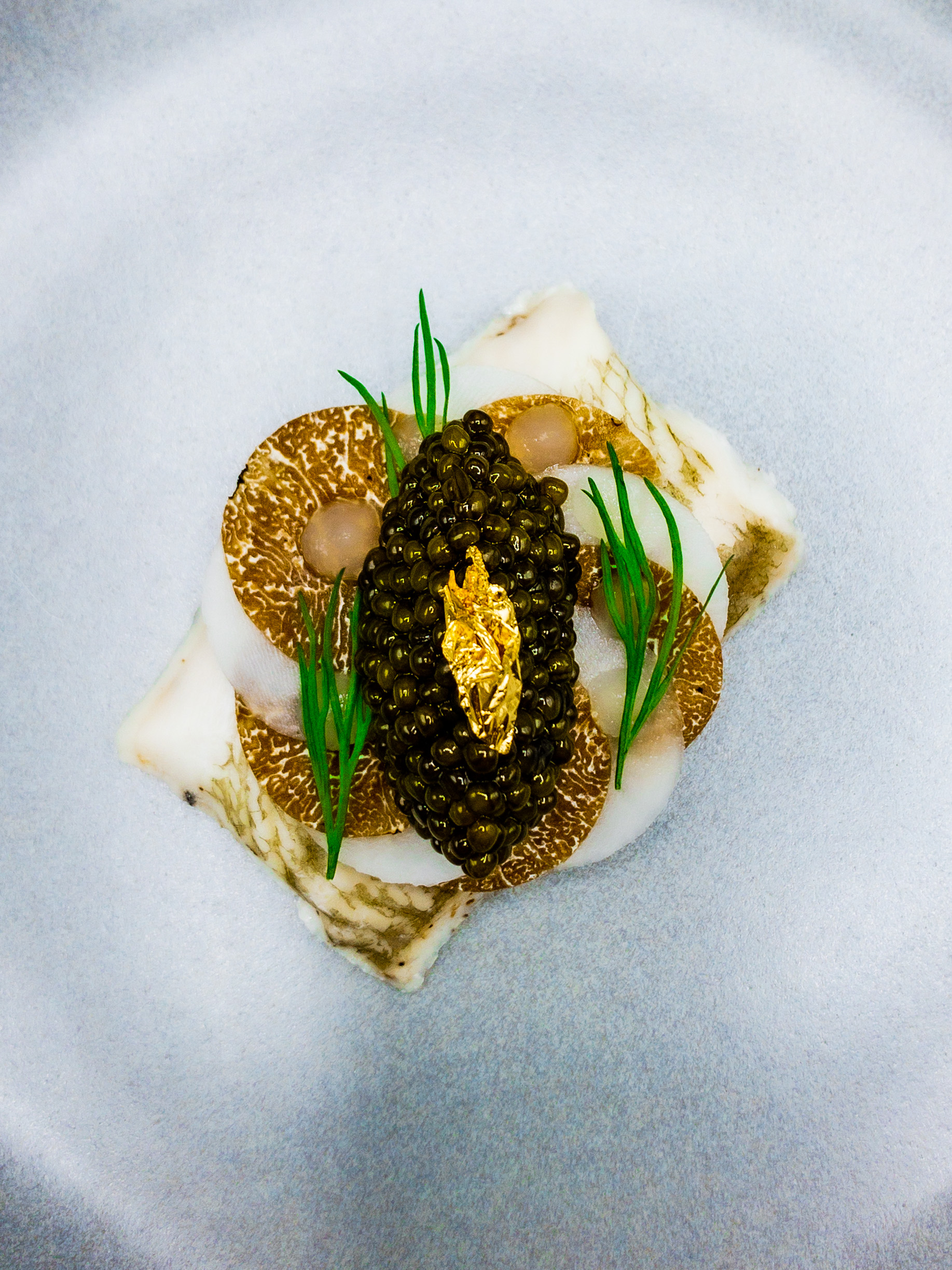 - Place (carefully!) a leaf of gold leaf on top of the caviar.